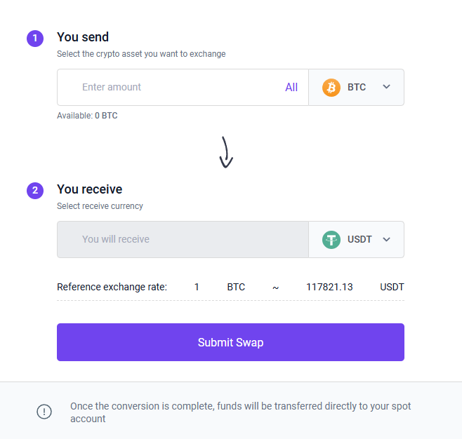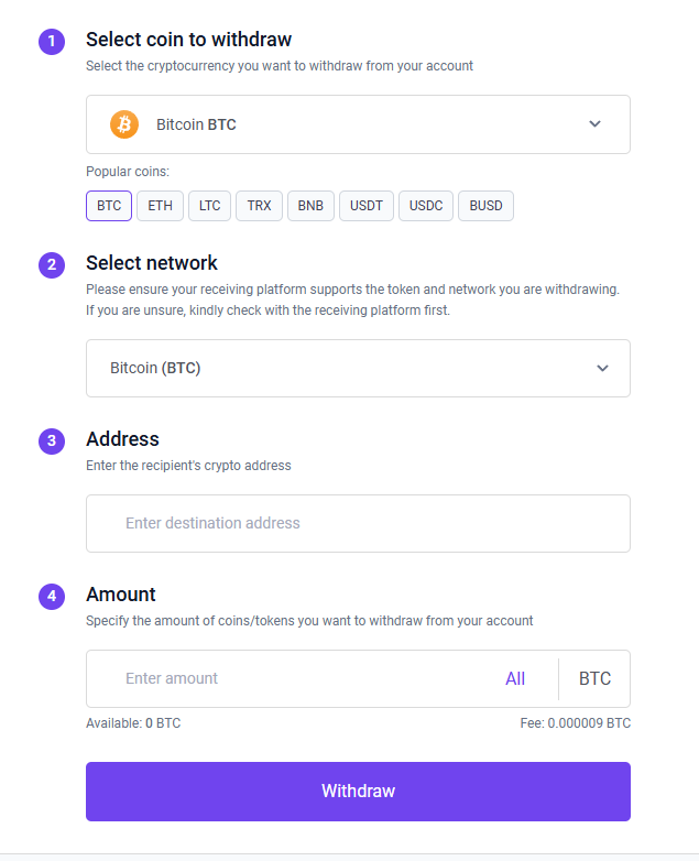 Создать заявку на получение крипты можно во вкладке Withdraw, выводить деньги в фиате нельзя. Аналогично с пополнением, выбираем токены, сеть и сумму, однако здесь еще и нужно вписать кошелек-получателя.