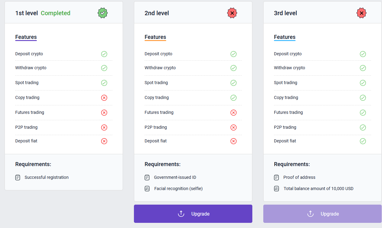 Функционал площадки различается в зависимости от уровня верификации. Первый этап пройден у каждого по умолчанию, для завершения второго необходимо загрузить фото документа и селфи. Третий открывается только при пополнении счета на 10+ тыс. долларов.