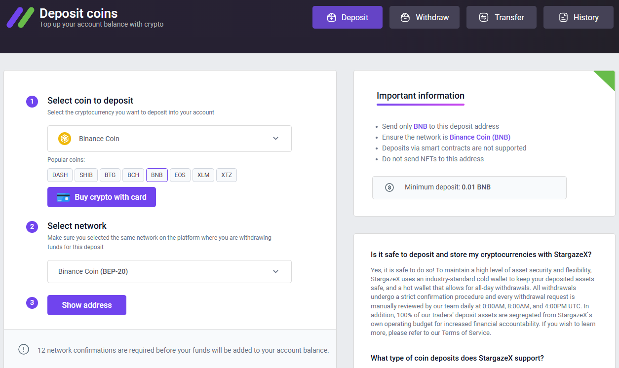 Криптовалюту тоже можно использовать для внесения средств на депозит. Для этого переходим в раздел Deposit и выбираем токены, в которых хотим пополнить счет. Далее указываем сумму и отправляем средства по адресу, который появится на экране. Для его считывания можно использовать и QR-код. Насколько вообще процедура безопасна и поступят ли деньги на торговый депозит — неясно, ведь Stargazex многим напоминает скам.