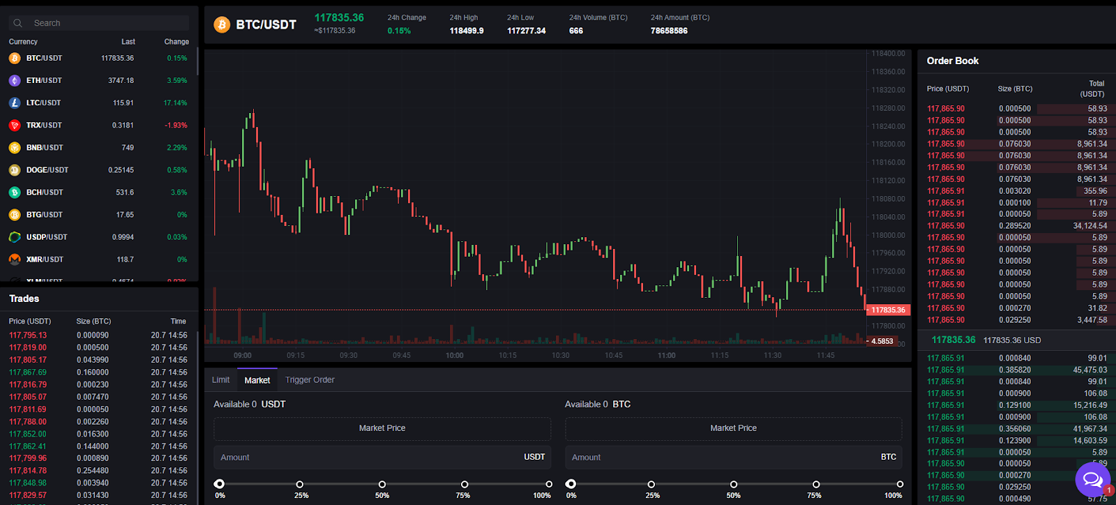 К спотовой торговле можно приступить после регистрации, для этого достаточно нажать на кнопку Spot в верхнем меню и перейти в терминал. Поскольку криптобиржи нет на сайтах-агрегаторах, то узнать о торговых объемах на данном рынке проблематично, а сама платформа такую информацию тоже не предоставляет. Тем не менее минимальные сведения на площадке все же имеются, но и по ним есть неточности. Например, на главной странице клиентам обещают доступ к 150+ активам, на деле же их около 100.