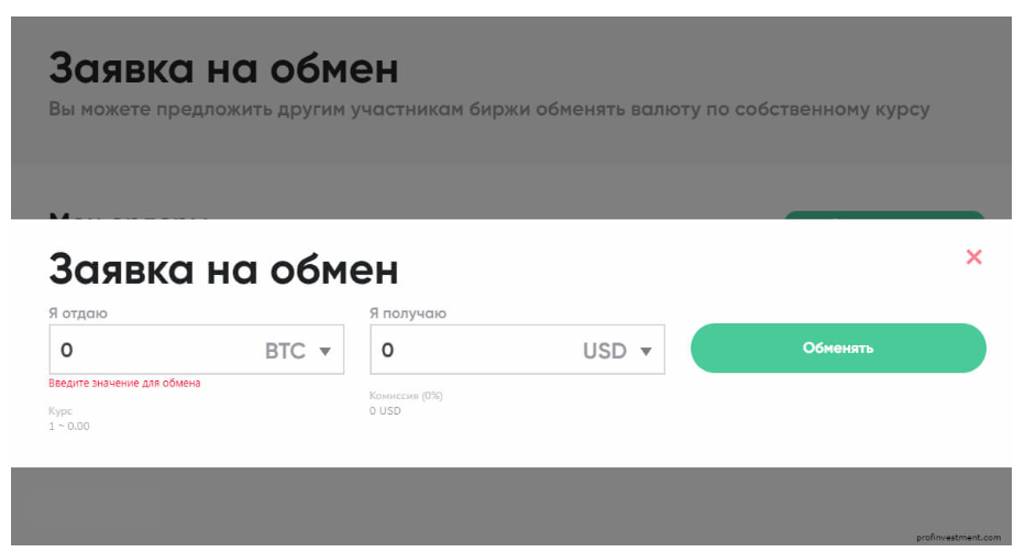 Режим «Обмен» создан для тех, кто заинтересован в максимально быстрых покупках и продажах криптовалют. Пользователи могли создавать заявки на обмен криптовалют по заданным ими курсам и использовать актуальные рыночные данные.