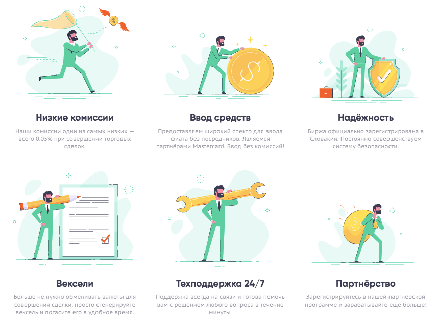 Функционально платформа сохранила прежний набор возможностей: спотовая торговля с лимитными и рыночными ордерами, режимы обмена криптовалют, цифровые векселя для переводов, партнерская программа. Однако многие разделы интерфейса пусты, а техническая поддержка не работает.