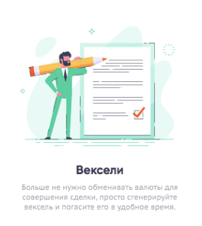 • Векселя — услуга по созданию цифровых долговых обязательств между пользователями.