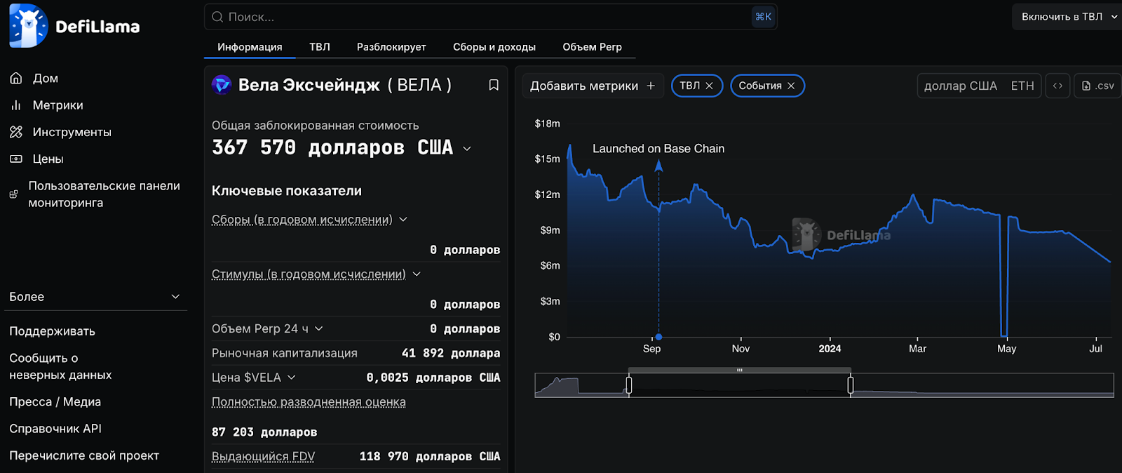 Информацию о резервах платформы можно найти на сторонних ресурсах, например DefiLama. Страховой фонд составляет примерно 370 тысяч долларов. На сайте «Вела Экчейндж» в разделе Tokenomics указано лишь то, что 10% от числа всех активов зарезервированы для будущих грантов, ликвидности на DEX и прочего.