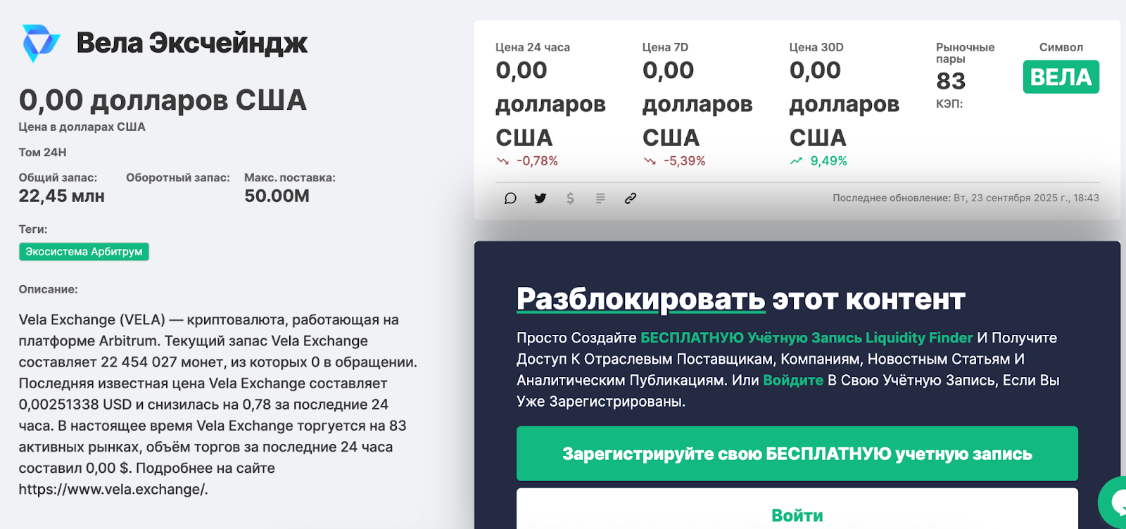 Vela Exchange поддерживает 83 активных торговых пары. Однако суточный объём торгов по ним составляет $0, что указывает на крайне низкую ликвидность и отсутствие активной торговли на платформе. Основная пара — VELA/WETH с объёмом около $1,64 за последние 24 часа. Это указывает на то, что быстро сбыть имеющиеся активы на этой площадке невозможно.