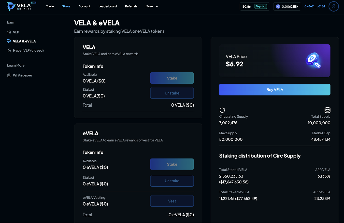 VELA — это основной токен проекта Vela Exchange. Его эмиссия ограничена, а используется он для вознаграждения трейдеров, стейкеров и провайдеров ликвидности. За стейкинг начисляются монеты VELA, но торговый объем составляет не более $30, поэтому эффективность этого способа заработка остается под вопросом.