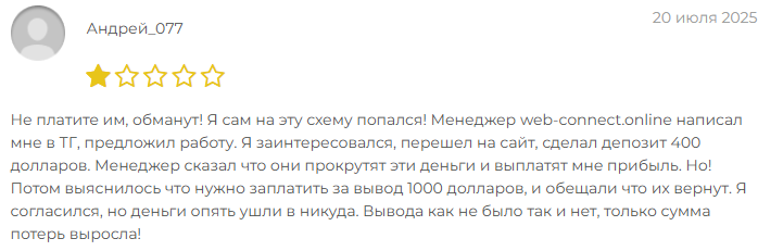 О том, что биржа сопряжена с риском потери средств, пишет пользователь Web Connect Online Андрей. По его словам, менеджер биржи сам предложил ему работу и клиент вложил $400. Исход известен — с него также запросили за перевод $1,000.