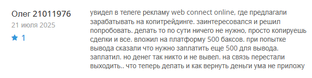 Олег узнал о проекте в телеграмм-канале и вложил в Web Connect Online $500. Ему сказали для осуществления транзакции заплатить столько же. Клиент утверждает, что заплатил деньги, но свои средства так и не увидел.