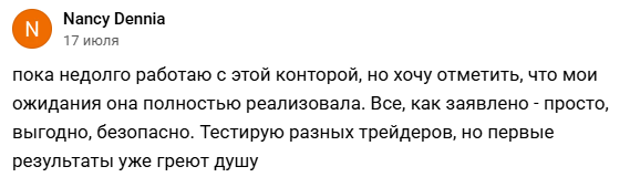 Еще одна довольная пользовательница говорит, что площадка полностью оправдала ее ожидания. Инвестор тестировала нескольких трейдеров, правда средства после проверок еще не выводила, но впечатления от функционала у нее положительные.