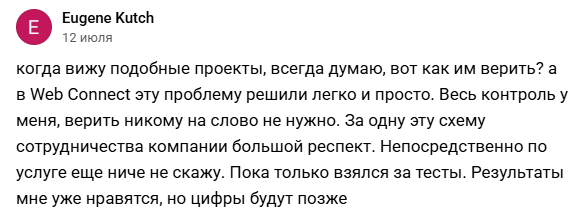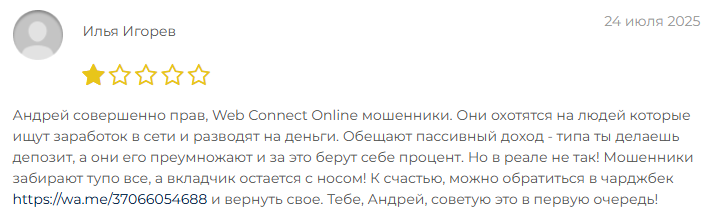 В интернете есть как положительные отзывы о Web Connect Online, так и отрицательные. Пользователь Евгений отмечает, что нашел выгодную для себя схему сотрудничества. Пока он не готов дать полноценный комментарий с выводами, но на этапе тестирования площадки результаты ему нравились.