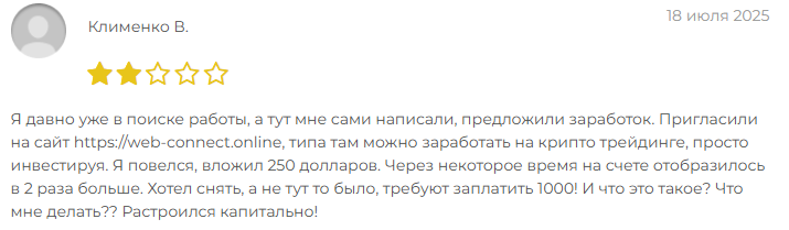 Негативные отзывы от пользователей более конкретные. Клиент Web Connect Online Клименко В. вложил в проект $250 и получил в два раза больше, но сделать транзакцию на вывод средств не смог — у него потребовали заплатить за нее $1,000. Таким образом цена вопроса вывода была в два раза больше заработанных средств.