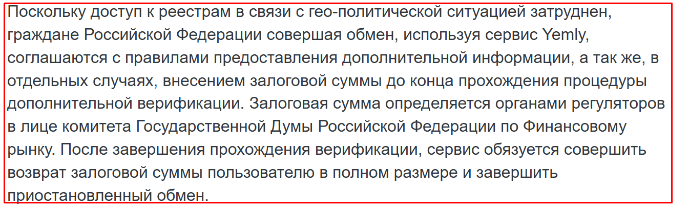 В последних немало «подводных камней». Например, указано, что Yemly является резидентами Российской Федерации. Как может быть резидентом псевдообменник без регистрации, у которого нет разрешительных документов от ЦБ РФ?